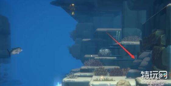 2、游到如下图所示的岩石的位置就可以往下放拐弯;