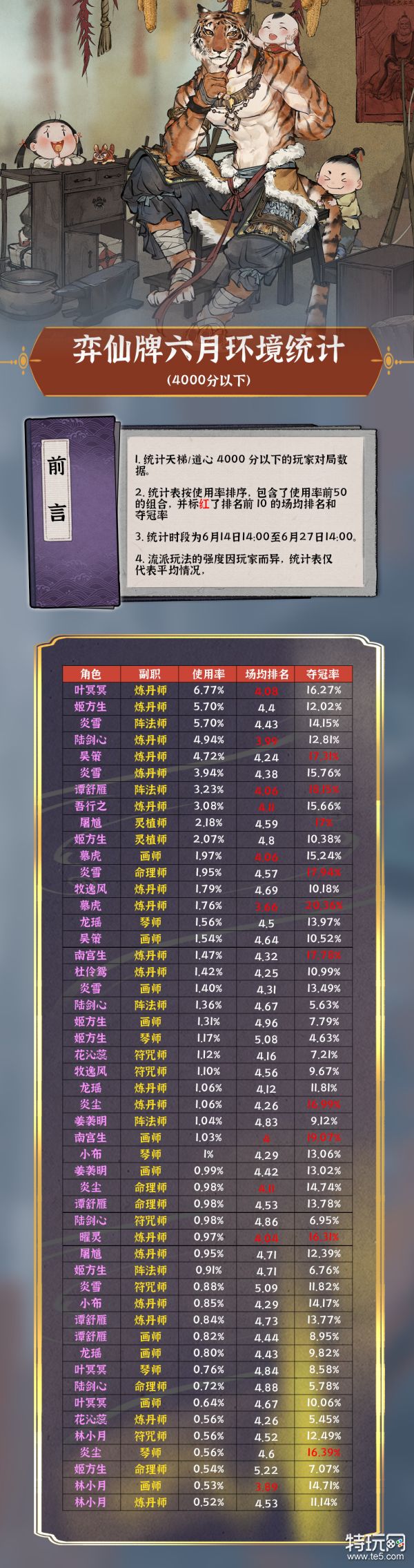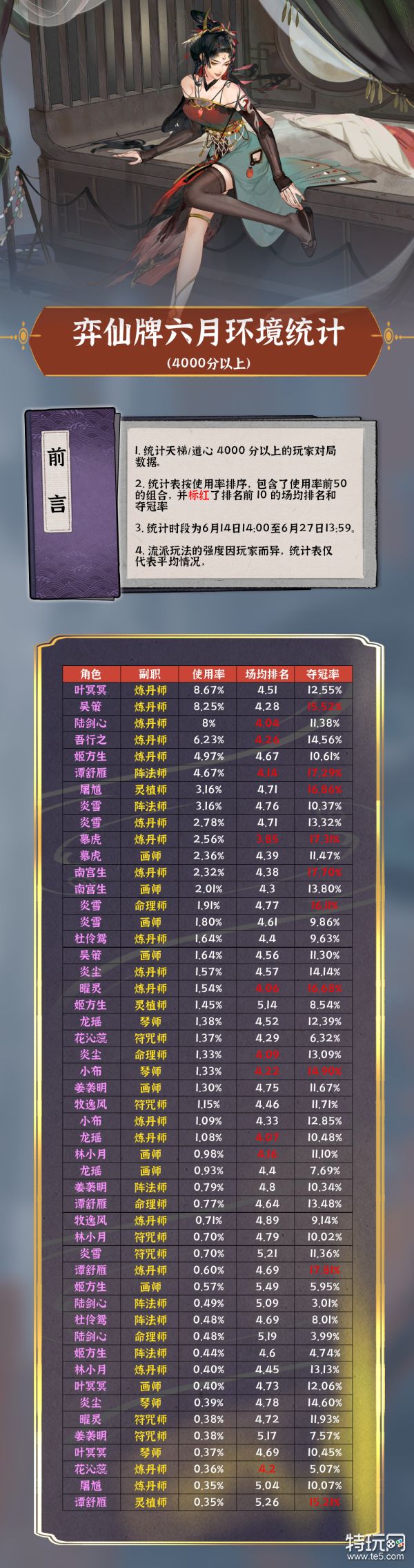 6月的天梯/道心数据同步公开,取4000分以上和4000分以下两个范围区间,统计时间为6月14日至6月27日。