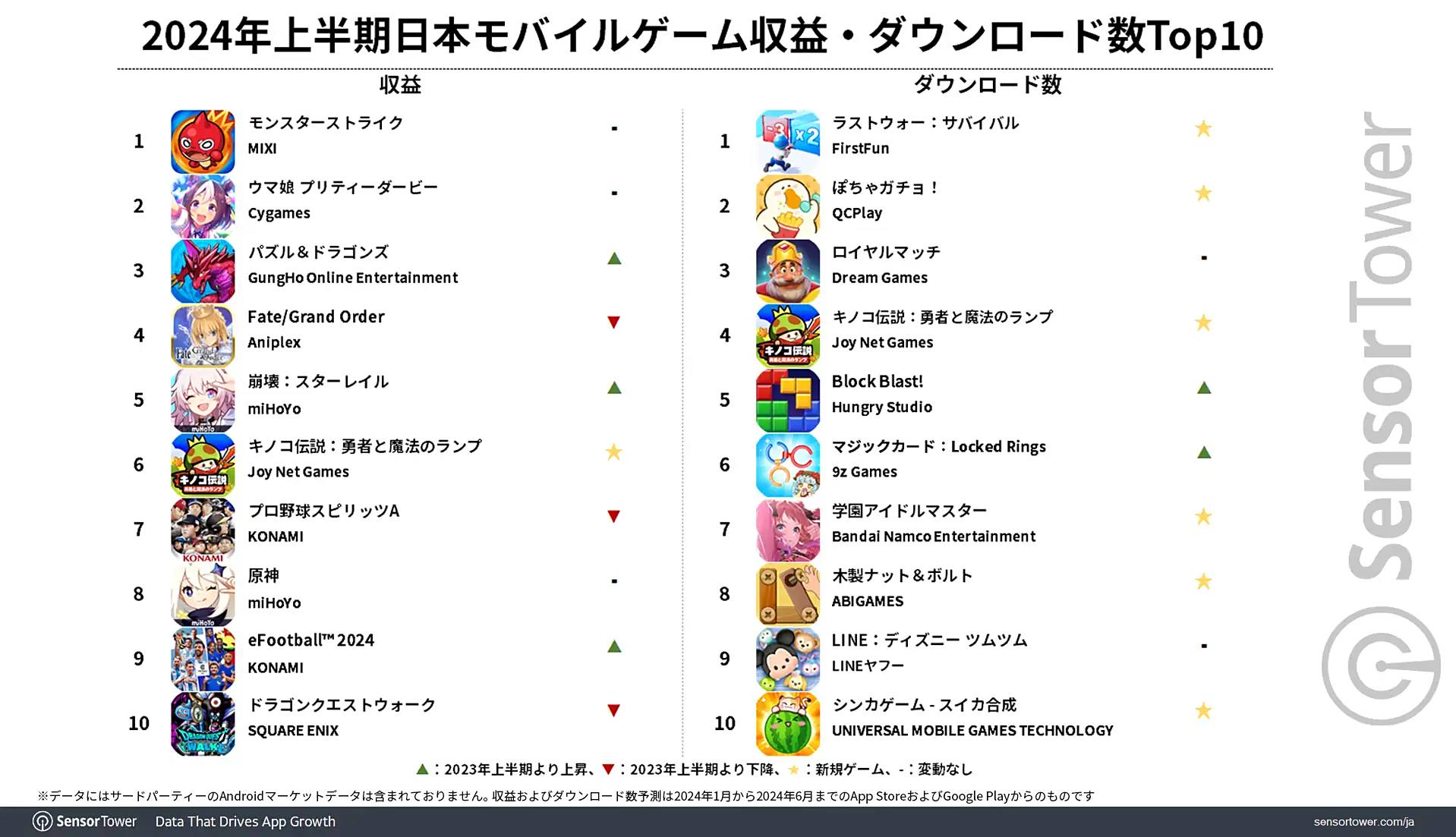 根据 Sensor Tower 的调查数据,2024 年上半年营收最高的手游为《怪物弹珠》,其次依序是《赛马娘 Pretty Derby》、《龙族拼图》、《Fate/Grand Order》、《崩坏:星穹铁道》。观察前 10 名可以发现,《怪物弹珠》、《龙族拼图》、《Fate/Grand Order》都属于营运已久的长青游戏,唯一入榜的新作只有今年 2 月 23 日上市的《菇勇者传说》,以只有 4 个月的统计时间来看,可以说其营收十分惊人。