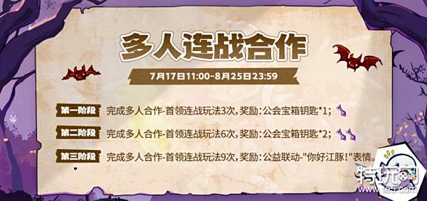 第一阶段:完成多人合作-首领连战玩法3次,奖励:公会宝箱钥匙*1;