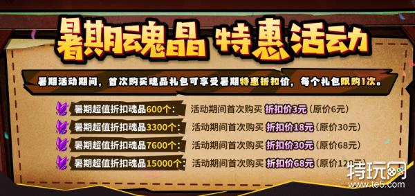 暑期活动期间,首次购买魂晶礼包可享受暑期特惠折扣价,每个礼包限购1次。