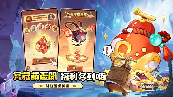 游戏主打不肝不氪,《胖太郎捉妖记》为减少玩家在游戏中的时间负担,游戏的主线推图和战斗都是自动进行。玩家只需搭配好自己想要的阵容后,队伍就会自动帮你捉妖打怪。推图过程中,玩家还有机会获得不同品质的葫芦,打开葫芦更有机会获得红将角色、神兵、招募券和元宝等各种福利道具,奖励满满!