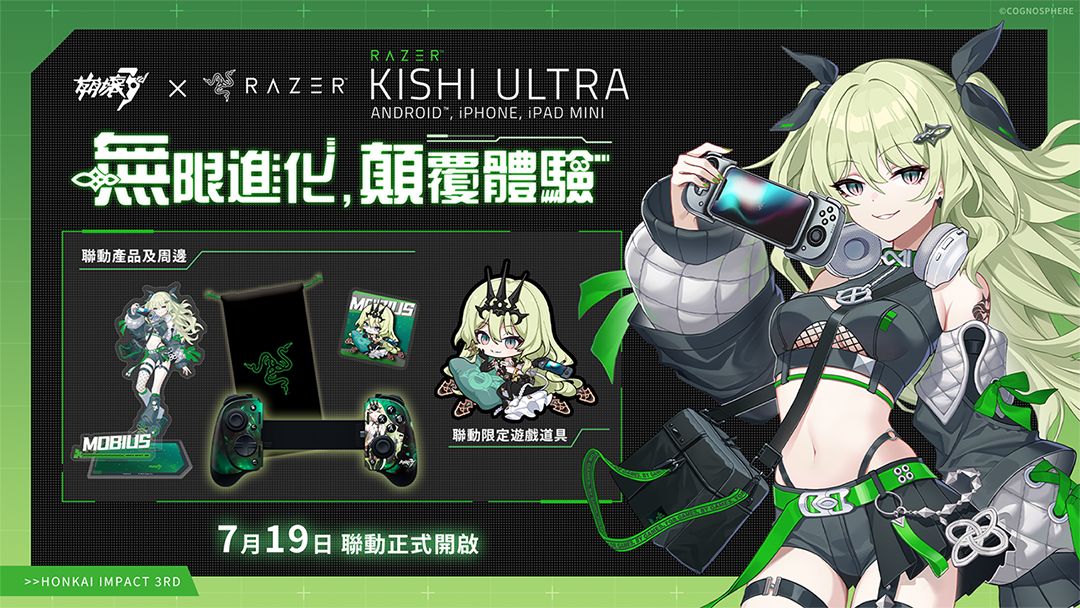 除了游戏内的活动之外,《崩坏 3rd》和 Razer 雷蛇的联动手把也正式启动。梅比乌斯主题涂装的 Razer Kishi Ultra 手把现已上架,即日起透过 Razer 官方管道预购,还可获得系列订製周边。感兴趣的舰长现可前往 Razer 线下官方店铺和线上官网购买。