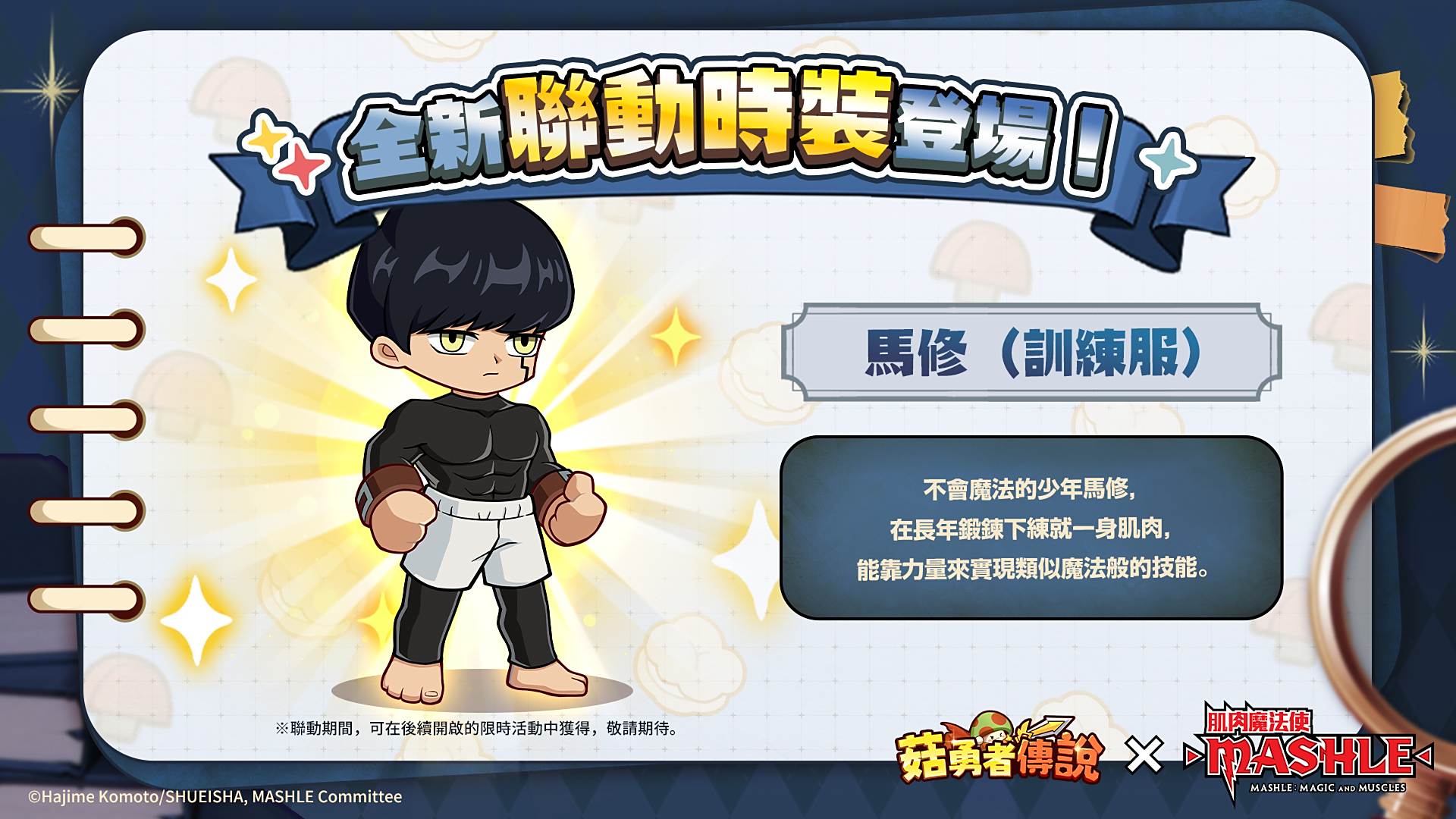 《菇勇者传说》×《肌肉魔法使-MASHLE-》联动活动正式开启,官方也非常热情地推出一系列社群活动,欲知更多联动活动情报,请持续关注《菇勇者传说》官方 FB 粉丝专页,随时获取游戏最新资讯!