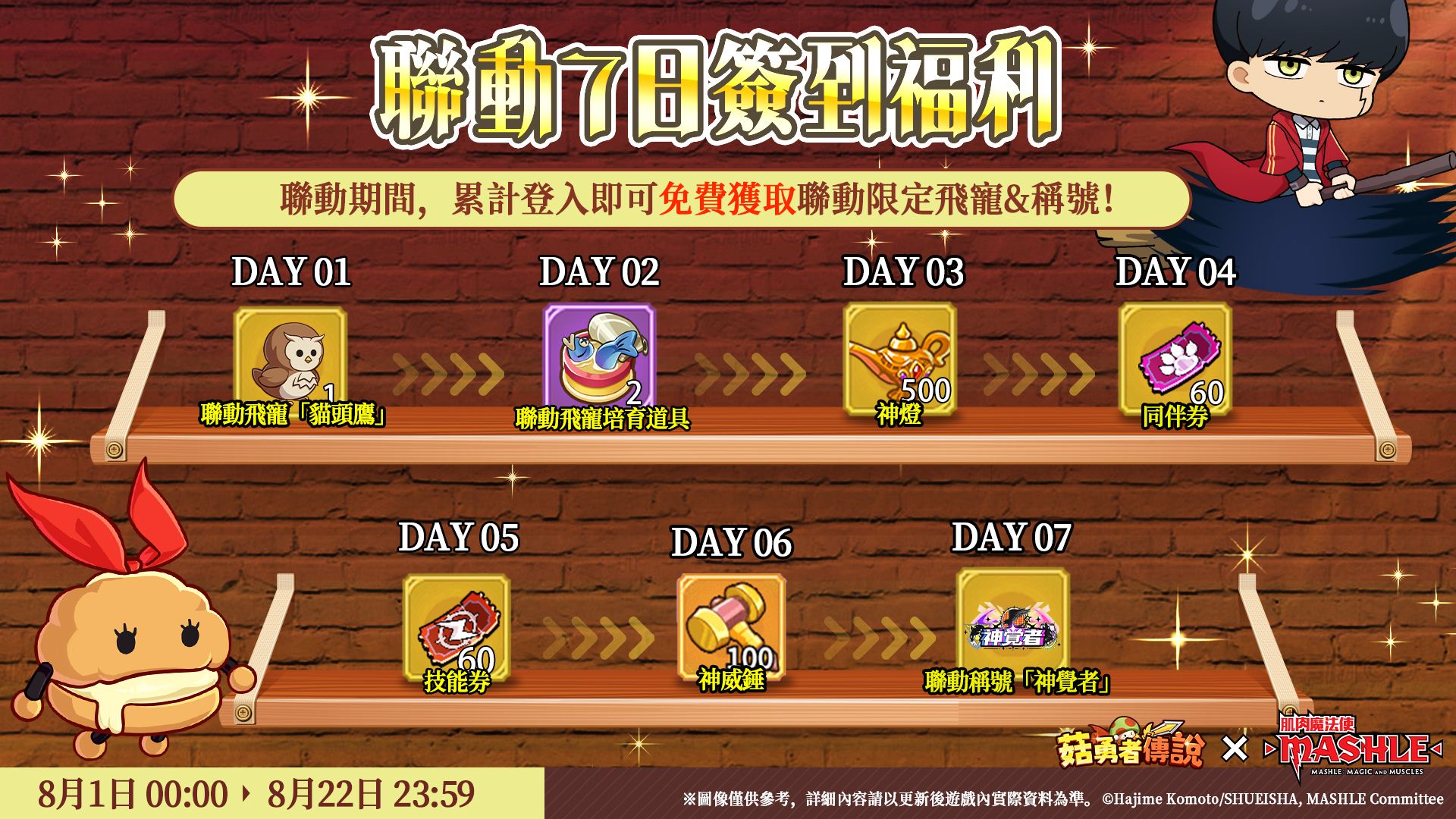 8 月 1 日起,游戏内将举办各种精彩的联动原创活动。参与活动可免费获得人气角色马修的联动时装马修(制服)和联动限定飞宠猫头鹰。此外,透过在活动中收集马修等角色的外观,还可以自由组合变身为喜欢的肌肉魔法使菇菇!