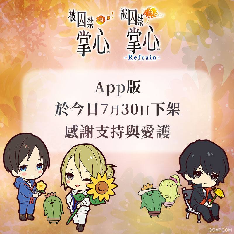 卡普空宣布,《被囚禁的掌心》及《被囚禁的掌心 Refrain》APP版将于7月30日下架终止销售,已购玩家可重载安装及访问云存档,感谢玩家长期支持。