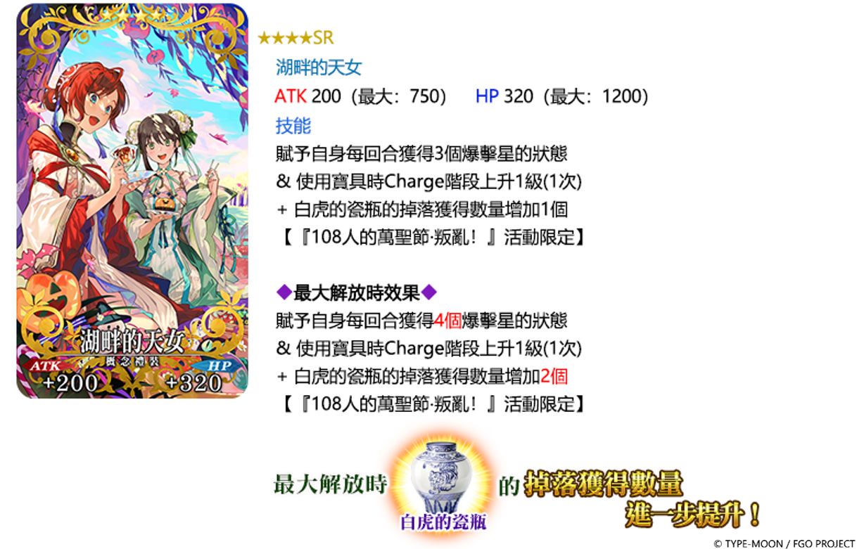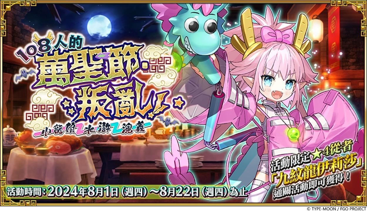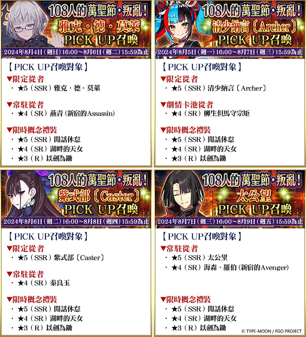 自 2024 年 8 月 4 日(日)16:00 起,与全新活动108 人的万圣节.叛乱!~ 小龙娘水浒演义~相关从者中,包含★5(SSR)雅克.德.莫莱、★5(SSR)清少纳言〔Archer〕及★5(SSR)紫式部〔Caster〕等 3 骑限定从者的 8 骑从者之 4 种召唤卡池将限时开放。