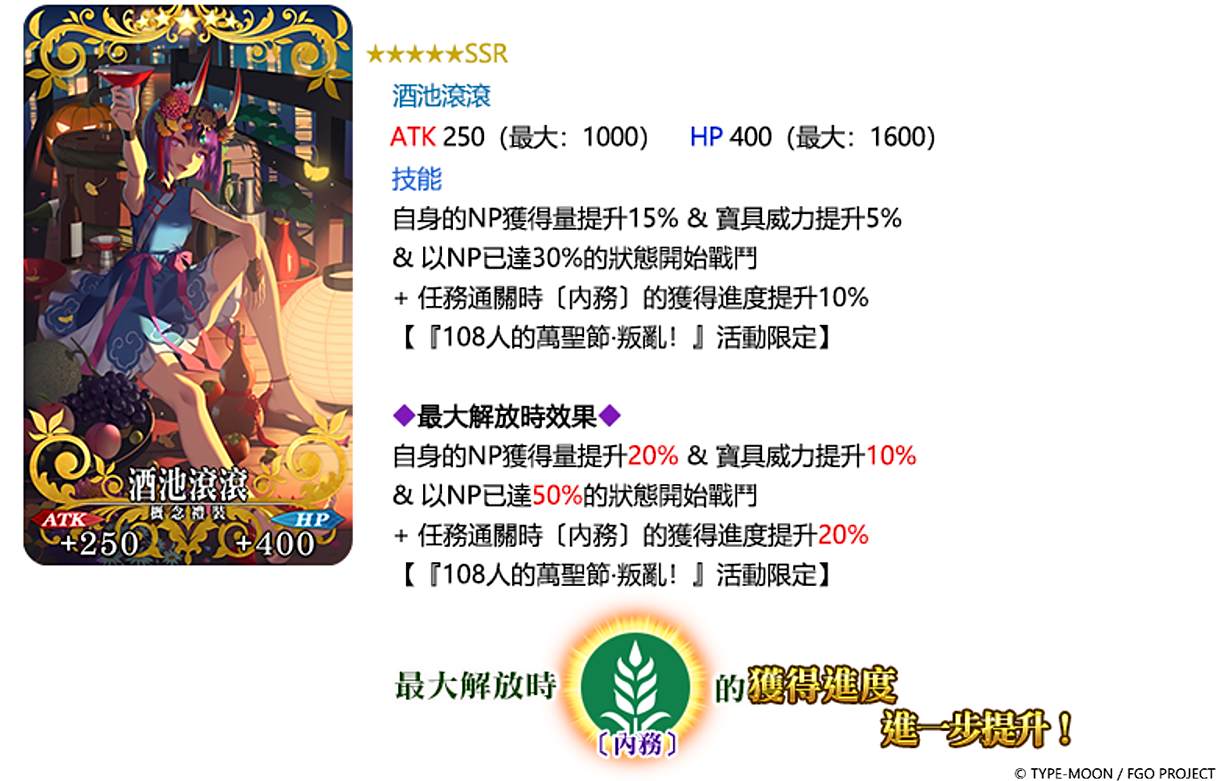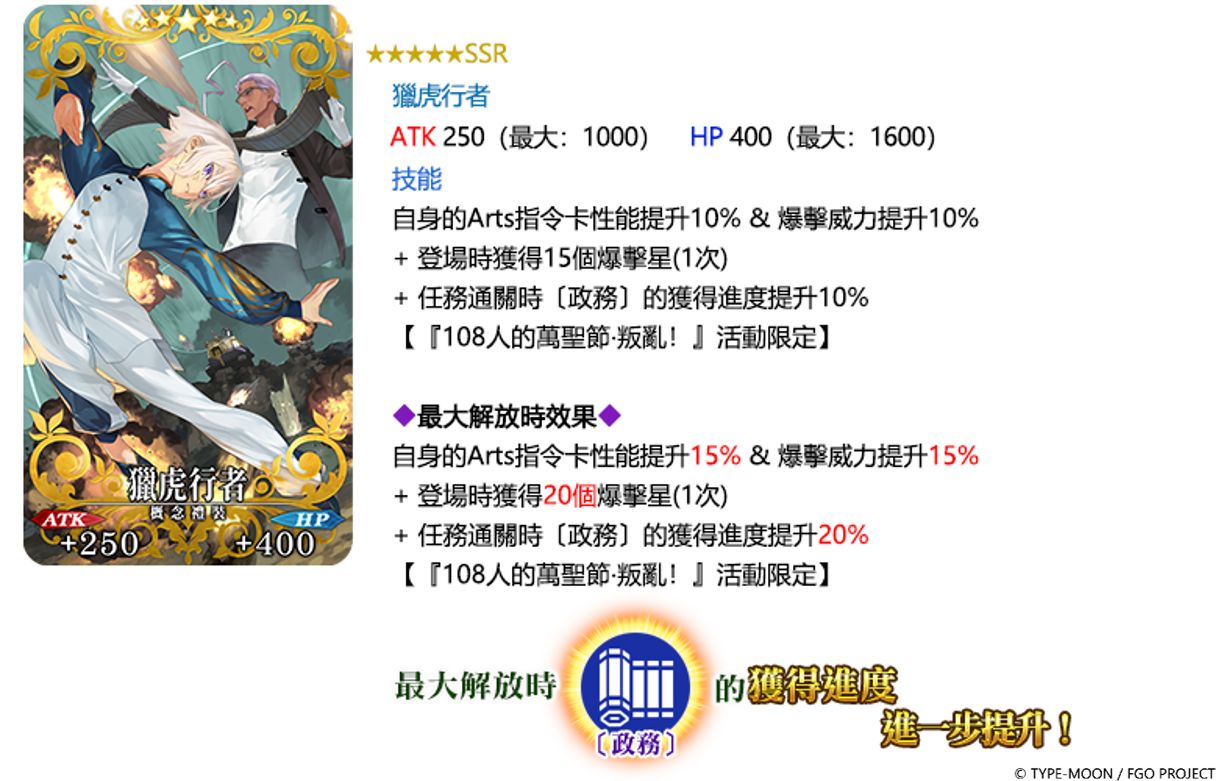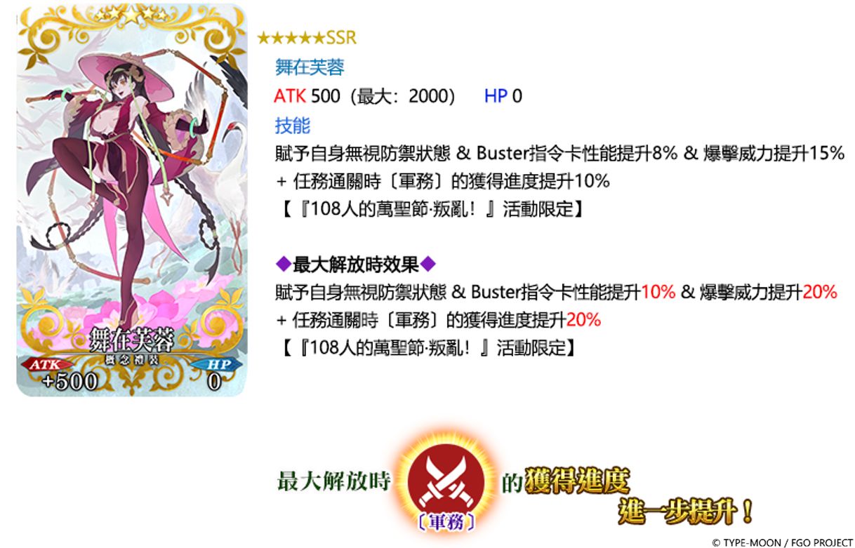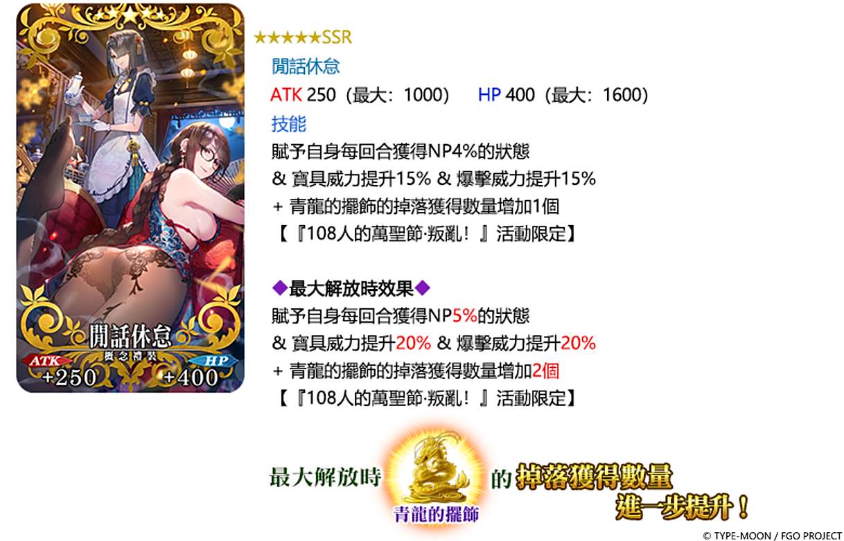 自 2024 年 8 月 4 日(日)16:00 起,与全新活动108 人的万圣节.叛乱!~ 小龙娘水浒演义~相关从者中,包含★5(SSR)雅克.德.莫莱、★5(SSR)清少纳言〔Archer〕及★5(SSR)紫式部〔Caster〕等 3 骑限定从者的 8 骑从者之 4 种召唤卡池将限时开放。