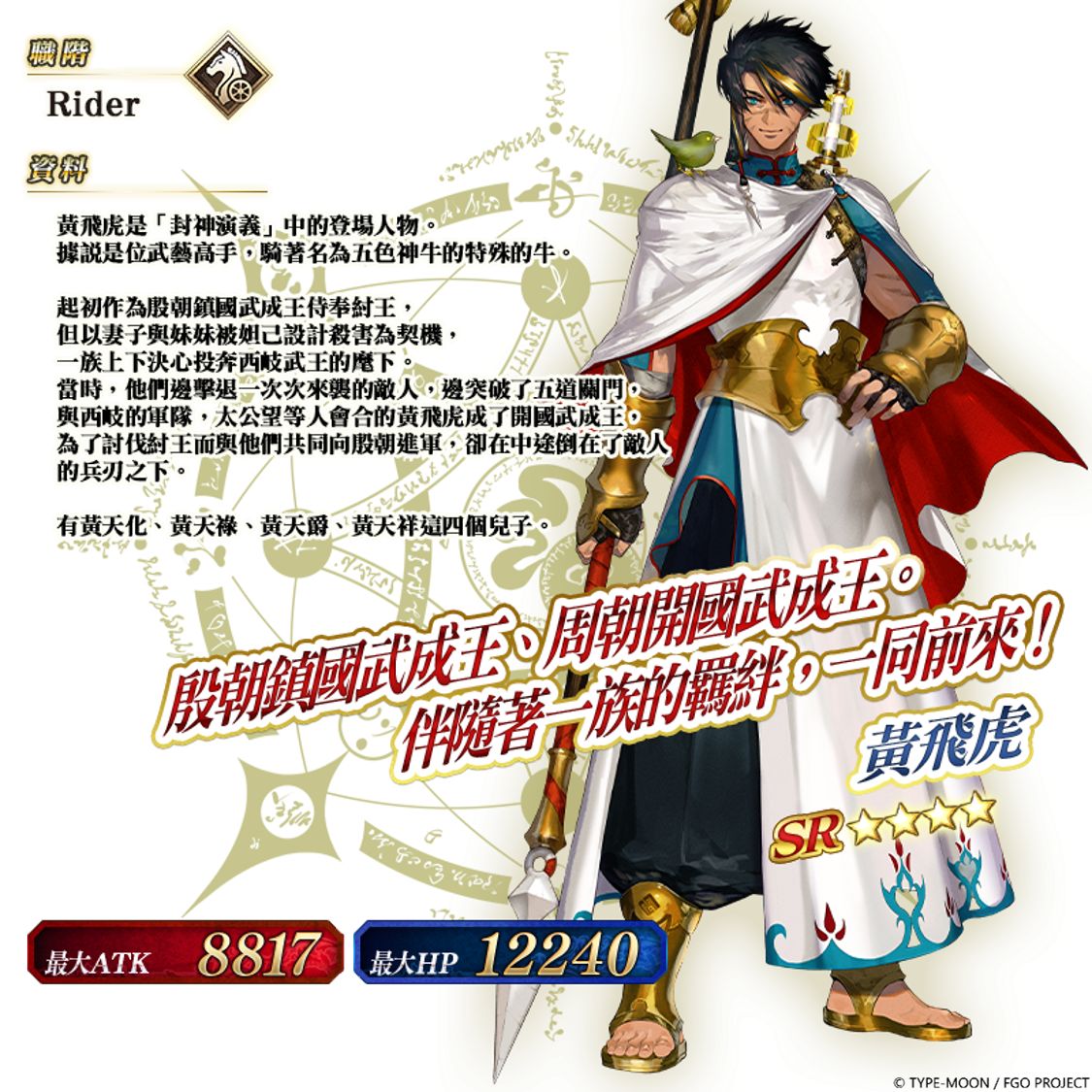 周朝开国武成王,也是位武艺高手的★4(SR)黄飞虎,透过宝具黄飞虎反五关.天化莫邪宝剑的施展,自身的 Quick 指令卡性能提升、Arts 指令卡性能提升、Buster 指令卡性能提升及对敌方单体发动超强大的攻击。