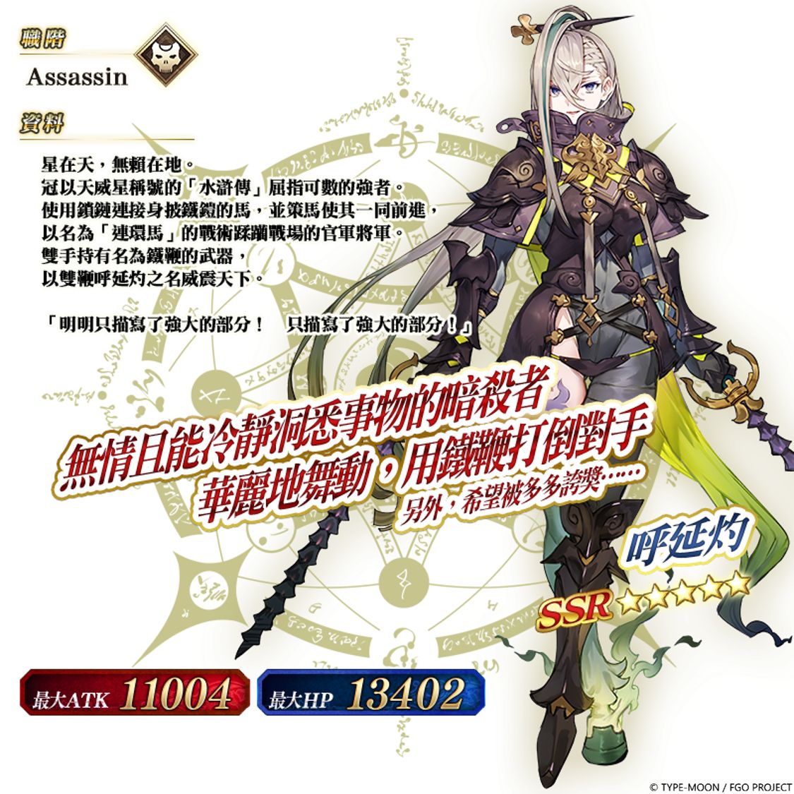 手持双鞭、威震天下的暗杀者★5(SSR)呼延灼,透过宝具连环马大岚阵的施展,自身的 Quick 指令卡性能提升,并对敌方全体发动强大的〔恶〕特攻攻击,同时低机率赋予晕眩状态。