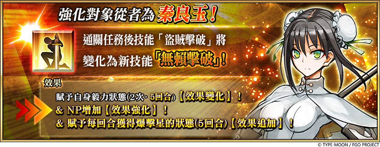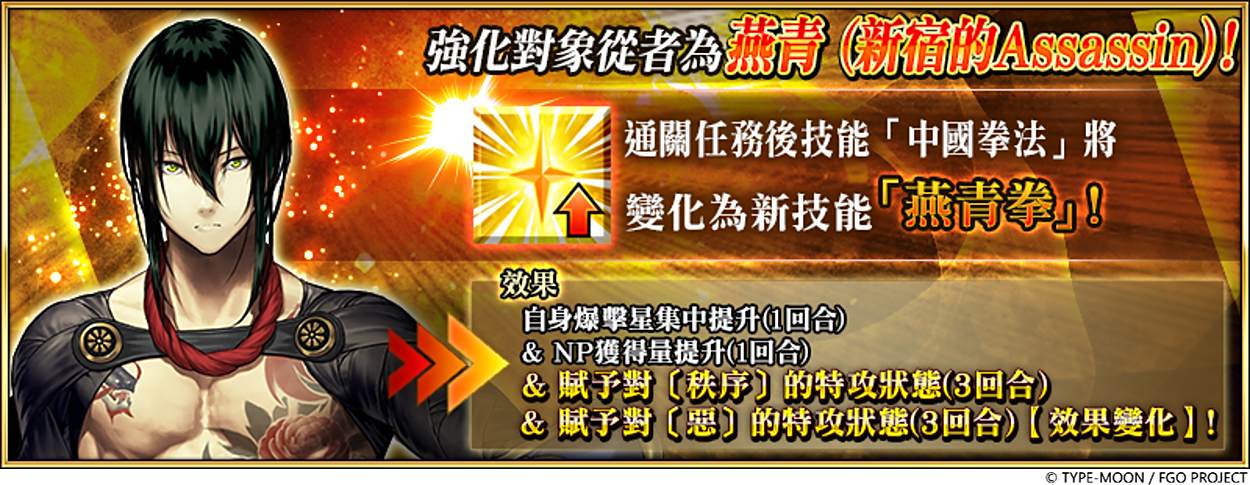 此外,★4(SR)秦良玉及★4(SR)燕青 (新宿的 Assassin)的从者强化任务,将在迦勒底之门中作为常驻任务追加,通关任务后不仅可以强化对象从者,还可以获得圣晶石奖励。