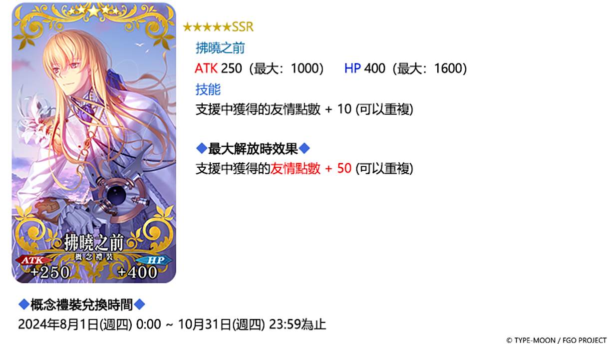 自 2024 年 8 月 1 日(四)00:00 起,御主们可前往达.文西工房,透过魔力稜镜兑换限时概念礼装★5(SSR)拂晓之前。