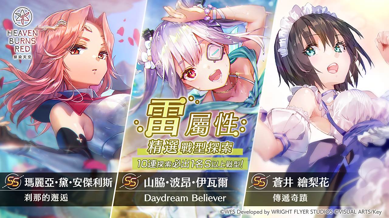 《绯染天空 Heaven Burns Red》宣布8月30日起举行雷属性精选战型探索,特定角色出现率提升;并启动雷属性强化应援活动,为9月6日恒星扫蕩战线做准备,玩家可获取强化材料。