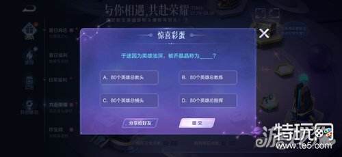 王者荣耀于途因为英雄池深被乔晶晶称为什么答案,于途因为英雄池深被乔晶晶称为什么,是王者荣耀的新活动《与你相遇,共赴荣耀》活动的惊喜彩蛋问题之一,玩家回答对这个问题才能获得奖励,那么于途因为英雄池深被乔晶晶称为什么的答案是什么呢,小编来带大家看看正确的选项吧。