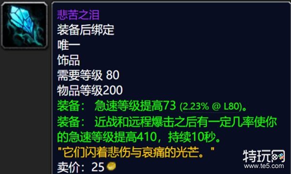 悲苦之泪由风暴峭壁初生的瓦格里小概率掉落(3.3.5数据库显示掉率为0.05%),急速是WLK P1阶段强势职业增强萨、刺杀贼和邪DK第一副属性,个人预测悲苦之泪将是WLK初期最贵装绑。