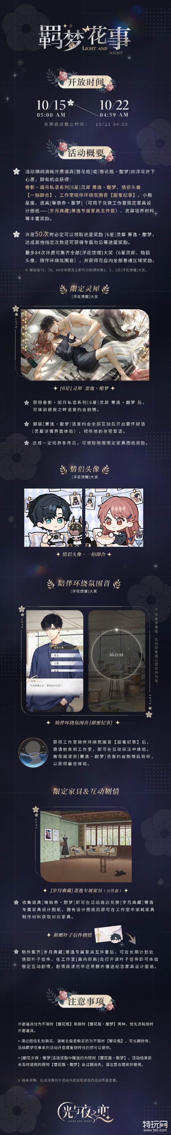 《光与夜之恋》游戏中羁梦花事酣梦活动即将在10月15日开启,活动期间消耗许愿道具[簪花瓶]或[簪花瓶・酣梦]向浮花许下心愿,即有机会获得眷影・闺月私语系列[6星]灵犀 萧逸・酣梦、情侣头像等,奖励还是不错的。