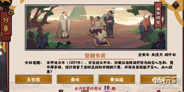 今日考题:宋开禧三年(1207年),宋金战火不休,但某位投降派奸臣为向金人乞和,竟不择手段,设计谋害了当时主战的宰相韩侂胄,并将其首级送予金人,此人就是?
