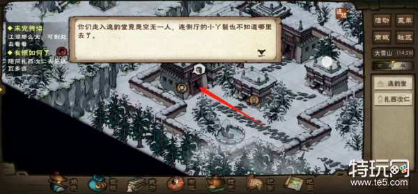 1、剧情触发后,主角与扎西次仁对话与他一起去青城山,然后跟随扎西次仁进入雍布堡左下角的逸韵堂(14,29),自动触发剧情发现人都不见了;