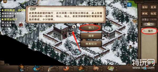 2、然后剧情提示要去侧厅的地下室,直接往右边走一格(14,28),然后点一下“偏厅”,再点“侧门”、“进入”,就可以进到地下室;