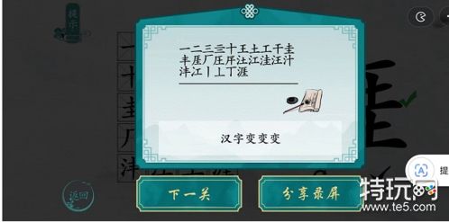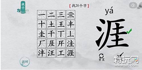 5、最后两行可以找到的字有很多,这一关的难度并不是很大:【厂、厓、厈、洼、沣、汪、工、涯】;