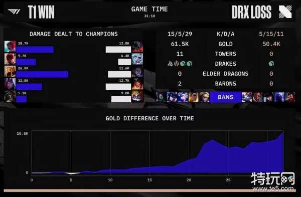27分钟,T1再次强势拿下大龙。后期31分钟,T1凭借巨大装备优势伤害碾压,一波推平DRX基地,先下一城!