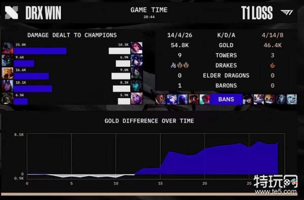 后期28分钟,DRX 凭借大龙 Buff 和巨大装备优势,伤害碾压一波推平T1基地,将比赛拖入决胜局!
