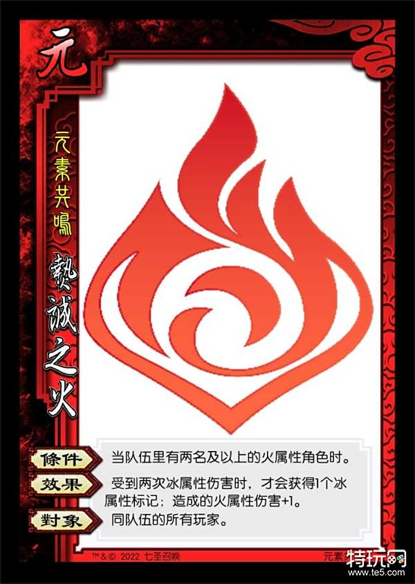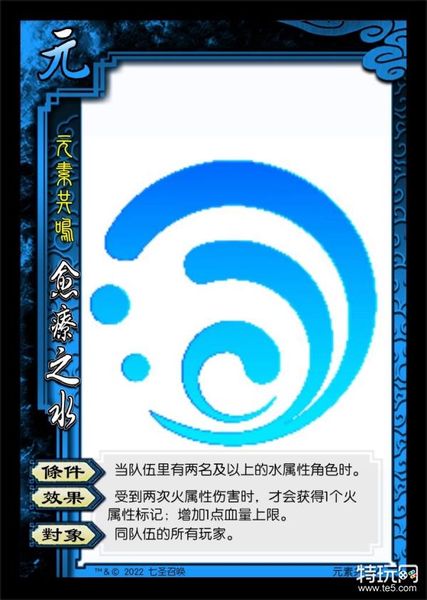 团队中有两个以上水系角色;只有在两次火系攻击中,火焰印记才会出现。玩家的生命值上限提升1点。