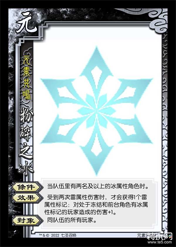 在团队中拥有两个以上的冰元素角色时;每一次被击中,都会有一道雷霆印记。对被冰封或被冰封的人物造成+1的伤害。