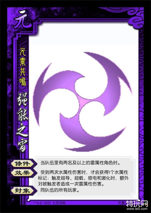 在团队中拥有两个或更多的雷元素;当你遭受两次水元素攻击时,你将会得到一道水系印记。超导,超负荷,感应,都会对目标造成一次雷系伤害。