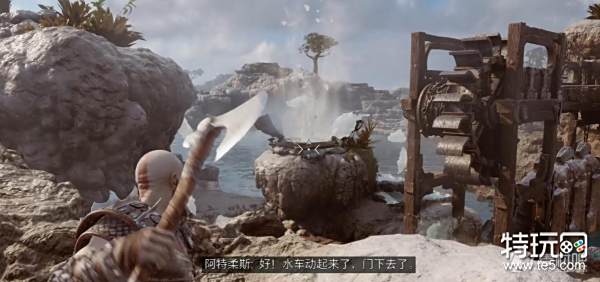 间歇泉需要玩家找到两个连动的泉水,用利维坦之斧的攻击冻住一个,另一个的喷泉水位就会上涨。上涨的水位会启动水车来打开道路。