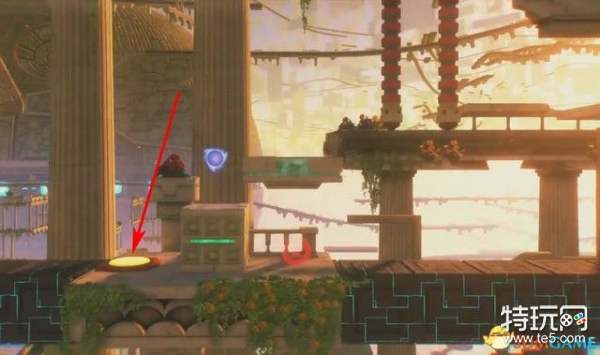 如下图箭头所指,踩着这个机关,使得平台上升,