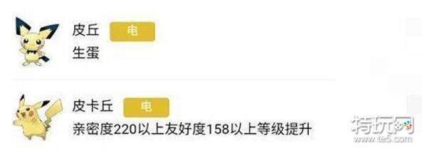 2、进化的条件:,生蛋然后变成皮丘,等到亲密度220以上,好友度158以上就可以变成皮卡丘;