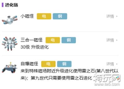 小磁怪在升到30级后就会进化为三合一磁怪,对三合一磁怪使用雷之石后就会升级为自爆磁怪。