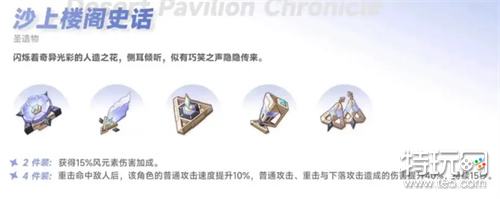 2、圣遗物效果:两件套-获得15%风元素伤害加成。4件套效果-重击命中敌人后,该角色的普通攻击速度提升10%,普通攻击、重击与下落攻击造成的伤害提升40%,持续15秒。