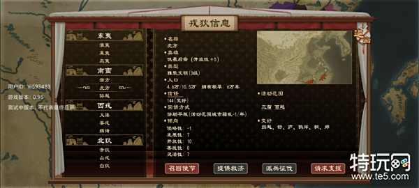 最重要小技巧,戎狄界面派使者交好,信任120以上,部落人力7500以上时可以请求兵力援助,以虎方为例,该部落人口常年数万,一次请求可得3000~20000预备军,堪称破局神器。
