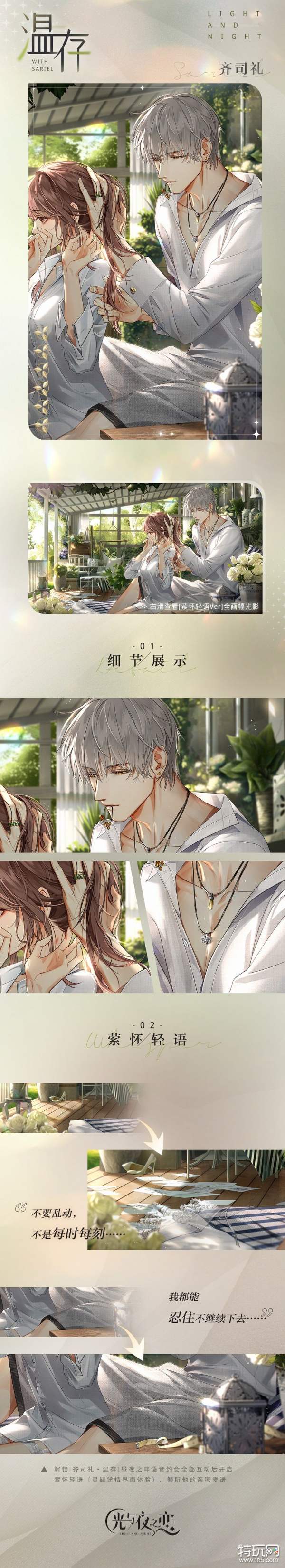 解锁[齐司礼・温存]昼夜之畔语音约会全部互动后可在【灵犀详情界面】开启专属系统【萦怀轻语】,鉴赏全画幅光影,倾听他的亲密爱语。