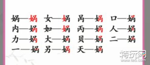 汉字找茬王娲找出15个字通关攻略解析是什么?答案是娲、女、呙、口、内、如、丙、人、力等字,那么下面特玩小编为大家分享汉字找茬王娲找出15个常见字答案。
