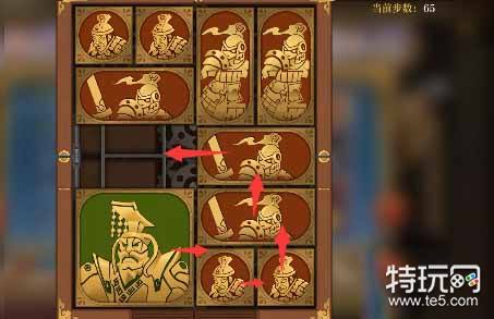 3、右侧小方块上移,右下水平方块上移,左下水平方块右移,小方块竖直摆放,左上竖直方块下移到左下角,将军左移一格。