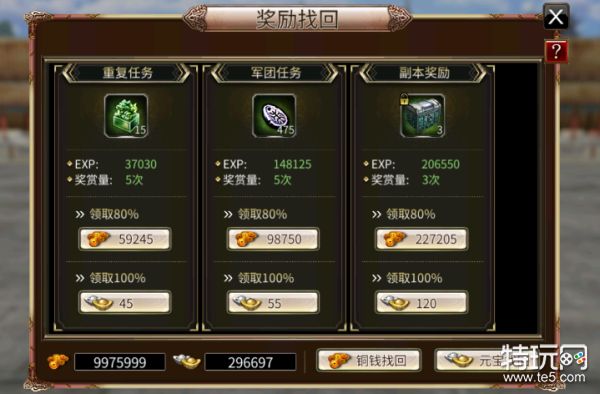 铜钱找回只能取回指定次数总和80%的经验值;元宝找回则可以取回100%的经验以及部分奖励物品或点数。