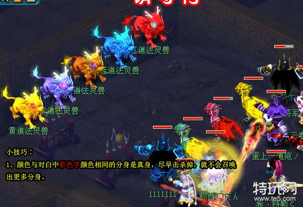 小贴士∶1、颜色与对白中彩色字颜色相同的分身是真身,尽早击杀掉,就不会召唤出更多分身。。
