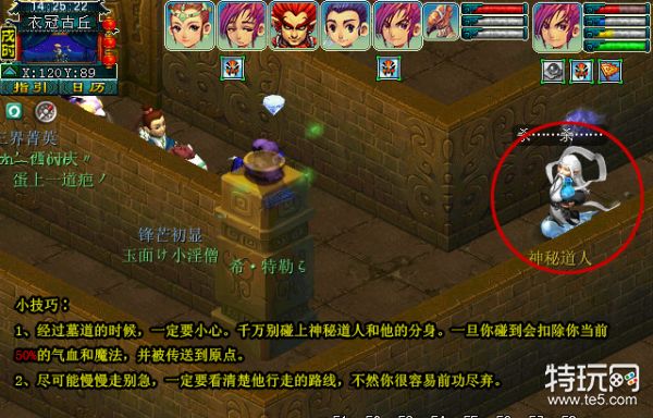 1、经过墓道的时候,一定要小心。千万别碰上神秘道人和他的分身。一旦你碰到会扣除你当前50%的气血和魔法,并被传送到原点。