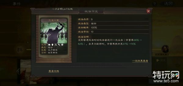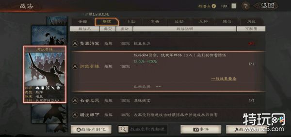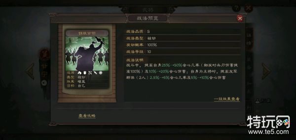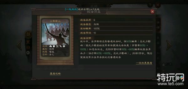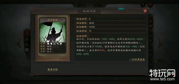 会为友军承担30%的伤害,(承担的伤害受自身统帅额外降低),当友军兵力高于70%时。会让队友伤害提高18%(受统率影响)。这个战法为整体队伍提供了坦度,和输出是不可缺少的角色。