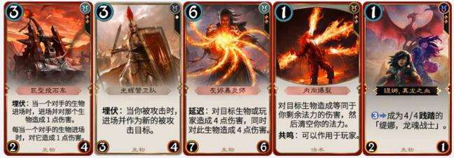 2、埋伏特效能够完美地配合【绊咒喷火仪】,自然是我们的首选;其次,有较强延迟特效的卡牌也是优先选择的对象。除此之外,根据剩余费用产生效果的卡牌以及有强力启动式异能的卡牌都能很好的配合。