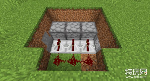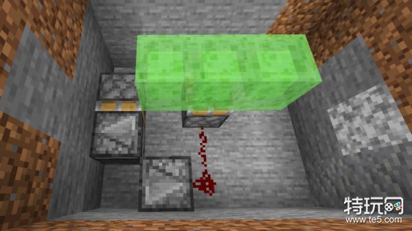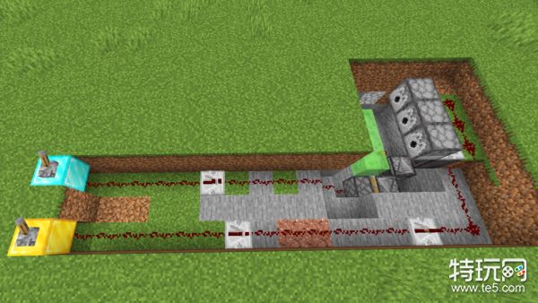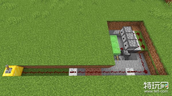 同理,把控制粘性活塞的红石线路,延伸到与刚才距离相同的地方,可以在拉杆下放不同的方块以便区分