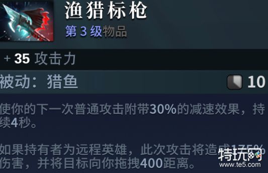 dota2渔猎标枪是近日后台代码出现的装备,大概率会在下个版本中推出,效果为下次普攻附带30%减速,如果是远程英雄会将敌人向自己拖拽400距离并附加175%伤害,可能为3、4级中立物品