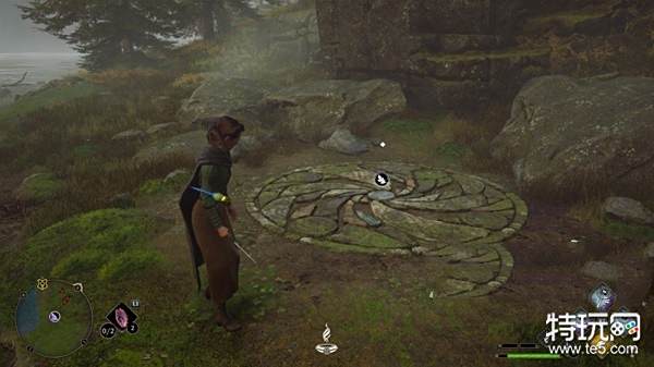 地面上有一个很大的圆形凹槽,附近还有一个大石球,用【统统飞走】咒语把这个石球推进凹槽即可。