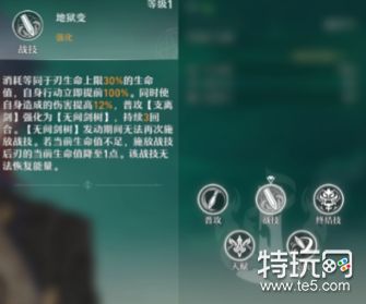 【地狱变】:释放后普攻会强化为群攻,且增加造成的伤害,持续三回合,但释放后会降低30%的生命值,虽不会导致刃死亡,却也会让生存压力暴增。