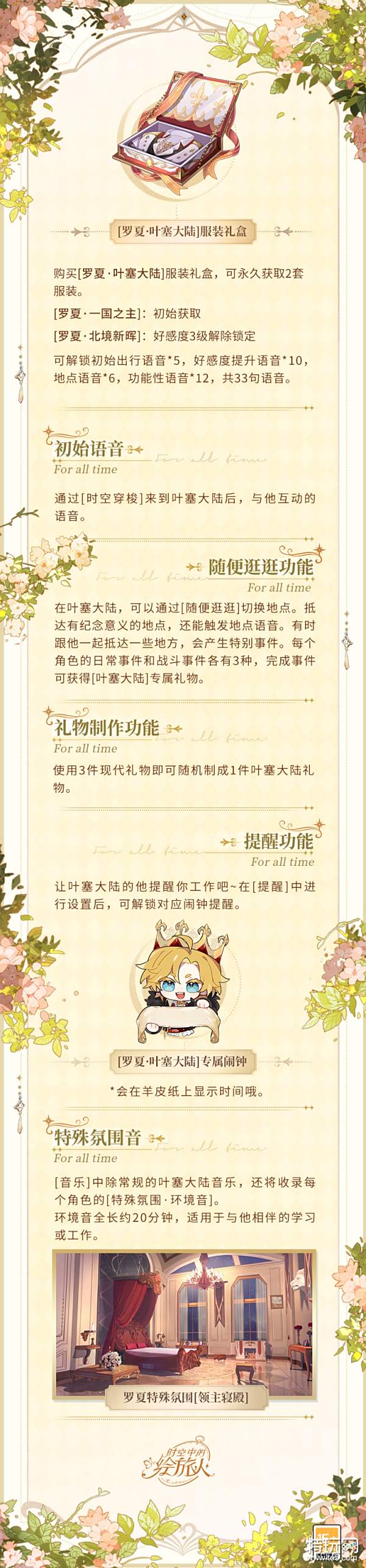 ► 购买[罗夏·叶塞大陆服装礼盒]并提升角色好感度,可解锁共计33句语音,包含5句初始出行语音、10句好感度提升语音、6句地点语音、12句功能性语音。