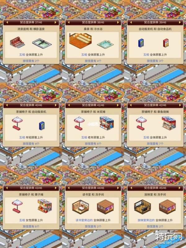 温泉物语2游戏中各种建筑都是有契合度了,将契合度高的设施建在一起会有更高的收益,今天就为大家整理了一下游戏中目前各类建筑的契合度,方便大家进行查看和建设,快来看看吧。