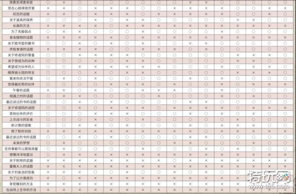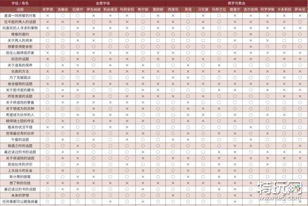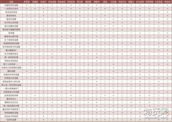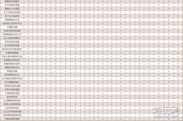 选择完茶叶后,玩家需要连续选择3个话题和邀请对象交流,出现的话题选项是从一个接近 100 个话题的题库中随机抽选,而每个角色对于各个话题都会有表现兴趣/没兴趣的反应,如果选择了有兴趣的话题,那么该角色的好感会提升,选择2次以上有兴趣的话题那么在茶会后可以提升主人公和邀请对象的魅力,连续成功选择3次有兴趣的话题,那么会进入各个角色专用的第4个问答,以下是全部角色对全部话题兴趣与否的资料。
